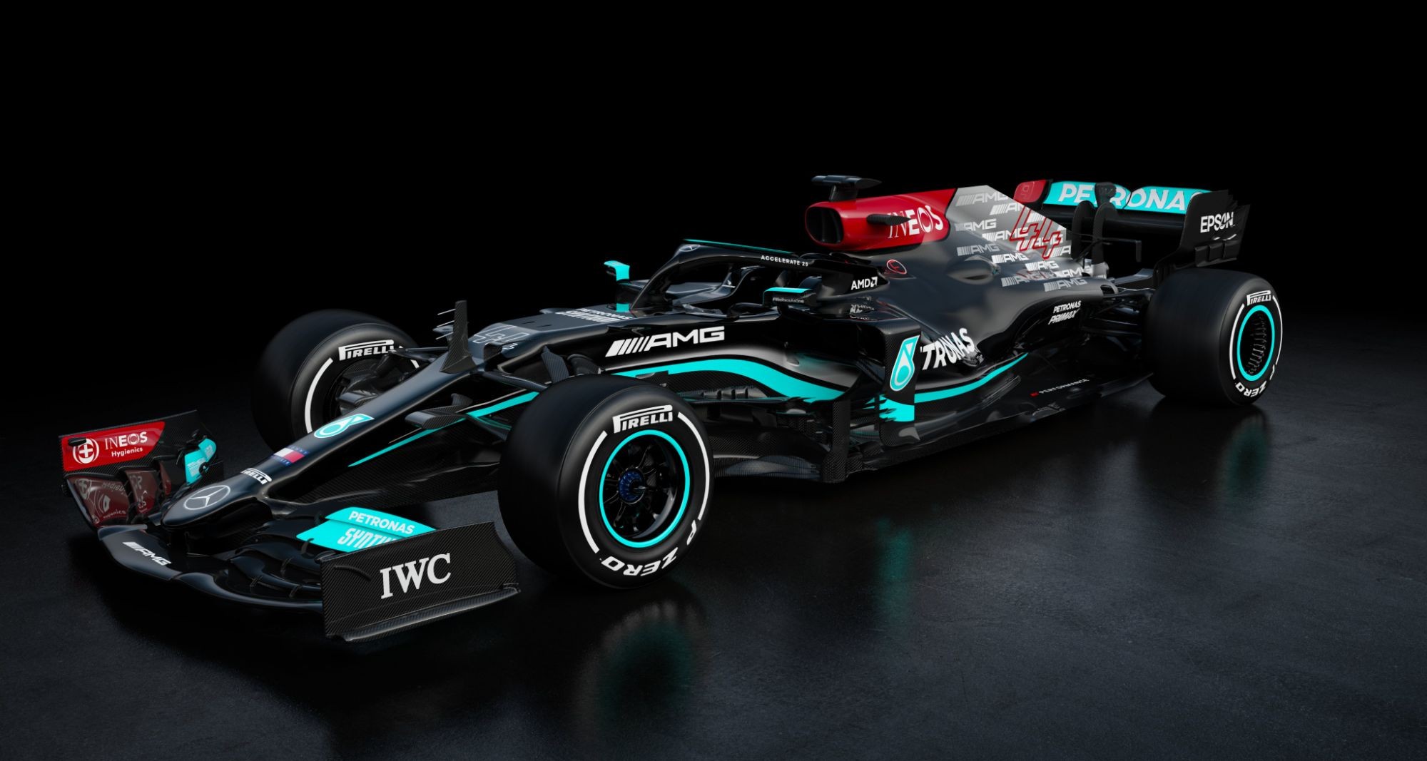 W12 сохранил базовую черную ливрею. Такую раскраску болид получил в прошлом сезоне в знак поддержки борьбы с расизмом и дискриминацией. Черный цвет отлично подружился с бирюзовыми, серебристыми и красными элементами. На корпусе появилось множество логотипов AMG, а россыпь звезд на задней части болида заменили на одну большую — в память о Ники Лауде.